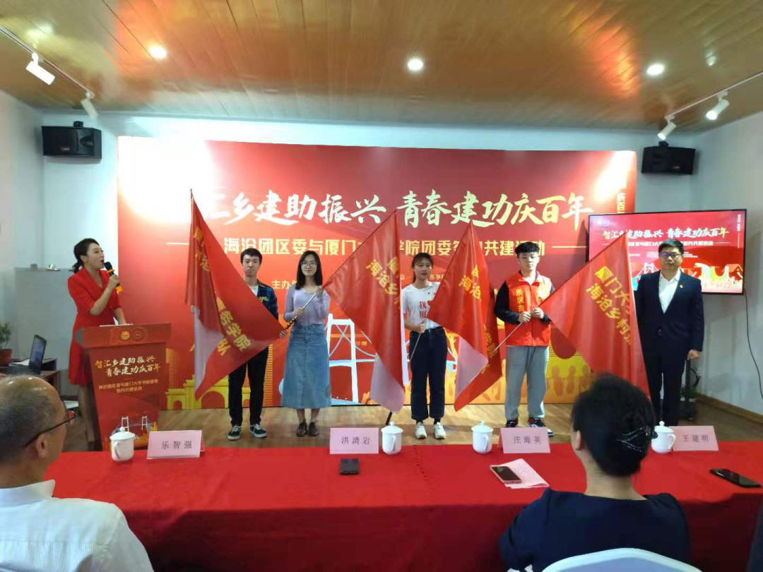 在签约授旗仪式上,海沧区委副书记庄海英首先致辞。她对厦门大学师生代表的到来表示热烈欢迎,对百年厦大人才培养及海沧区在乡村振兴取得的成效表示肯定。她认为,高校青年服务于乡村振兴建设有重要意义,希望海沧团区委深化与厦门大学星空(中国)团委的合作共建,双方充分利用资源优势,建立长效合作机制,共同发展,持续推进乡村振兴,实现校地共青团工作的合作共赢。