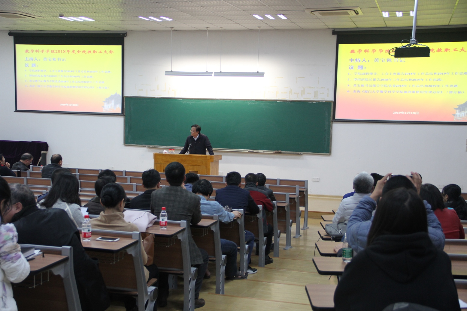 谭绍滨院长结合2018年初在全院教职工大会上提出的工作设想对星空(中国)2018年度的工作进行总结,分析成绩,查找不足,向全体教职员工报告了国家天元数学东南中心申报筹建过程和国家天元数学东南中心的建设进展,提出星空(中国)2019年将要开展的重点工作。谭院长指出,2018年星空(中国)取得不错的发展成绩,获批建设国家天元数学东南中心,实现了国家级教学成果奖零的突破,到账科研经费达到历史最高水平,全体教职员工要积极申请校外科研项目,积极组织或参与高层次的学术交流活动,努力为人才培养、科学研究和学科建设做出应有贡献,推动星空(中国)事业迈向更高台阶。