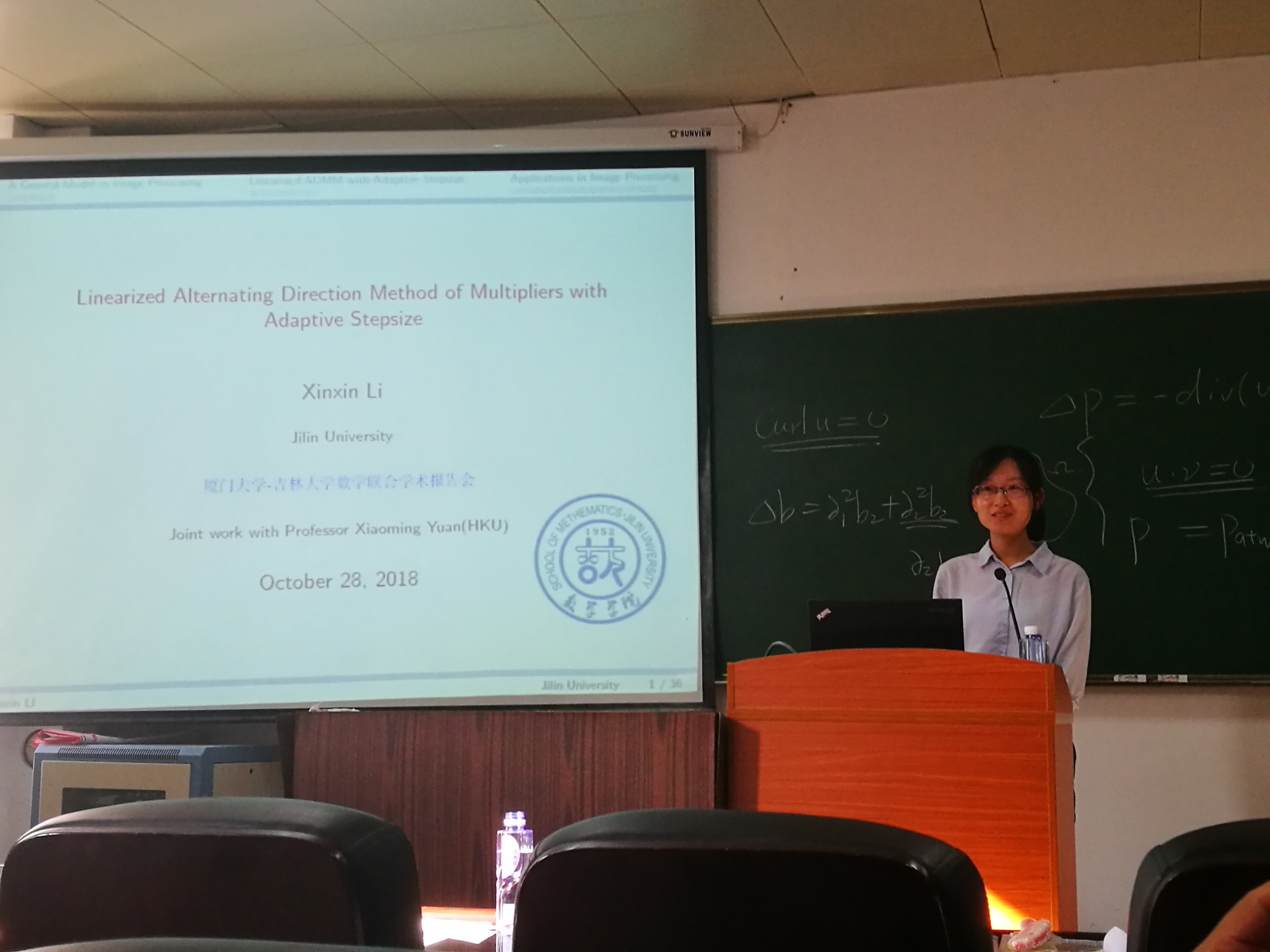 上午和下午的学术报告会分别由邱建贤副院长和张然副院长主持,双方数学工作者奉献了8场精彩的学术报告。吉林大学高丽媛、王培洁、聂元元、于浩然、李欣欣分别做题为《The instrituion fuction in income gap evolution》、《Inference on Semiparametric Transformation Model with General Interval-censored Failure Time Data》、《Perturbation Problems of Continuous Subsonic-Sonic Flows in Convergent Nozzles》、《Transfer and Its Applications》、《Linearized Alternating Direction Method of Multipliers with Adaptive Stepsize》的学术报告,我院梁薇、王焰金、黄文分别做题为《Empirical Likelihood for Differentiable Functionals under Doubly Censorship》、《Incompressible inviscid resistive MHD surface waves in 2D》、《Riemannian optimization and averaging symmetric positive definte matrices》的学术报告。