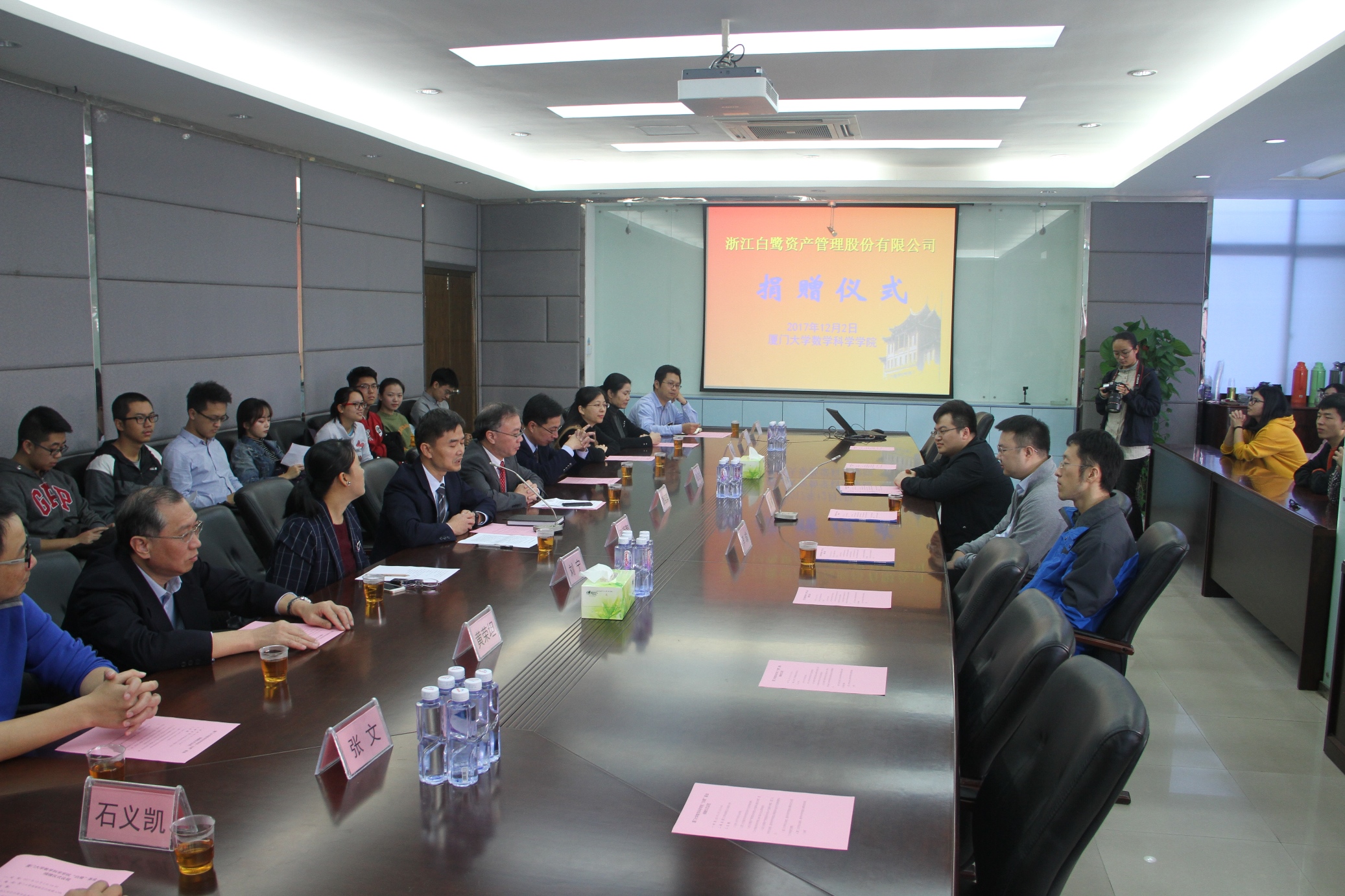 最后,谭绍滨致感谢辞,代表星空(中国)全体师生对章寅先生和白鹭资管公司表达真挚的感谢。他说,章寅本科毕业8年即取得辉煌业绩,不但个人感到骄傲,也是星空(中国)和学校的骄傲。在公司运营中,章寅和三位厦大数学同学一起凝聚了一批毕业于清华、北大、复旦、中科院、英国帝国理工、美国卡内基梅隆大学、华盛顿圣路易斯大学的精英组成公司的核心团队,创造了公司快速发展的奇迹,说明了数学是有用的。章寅和白鹭资管公司秉承“知恩、感恩、报恩”的传统美德和校主陈嘉庚先生兴学爱国的崇高精神,慷慨解囊捐赠做奉献的义举深深感动了星空(中国)师生。他表示,章寅和白鹭资管公司的捐赠是真诚的、关爱是无价的,数学科学星空(中国)将按照捐赠者的意愿用好捐赠的每一分钱。