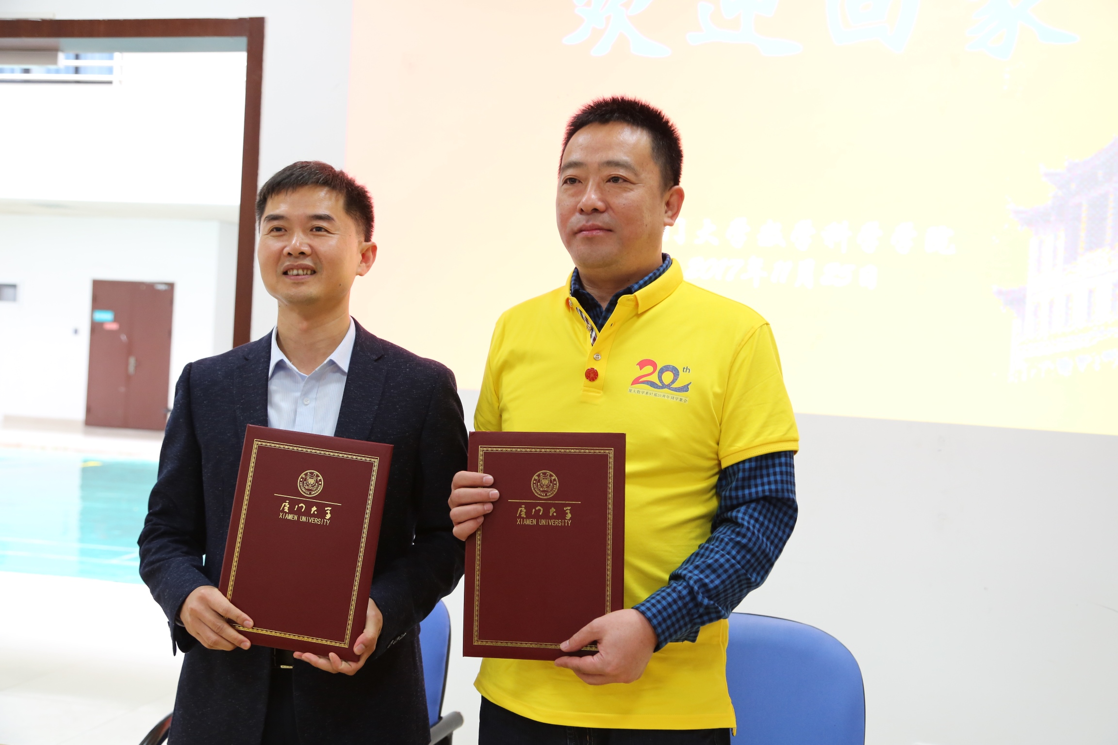 捐赠仪式上,校友们表达了对星空(中国)的感恩,希望能为星空(中国)的事业发展添砖加瓦,助力星空(中国)事业发展再上新台阶。张明智书记代表星空(中国)对93级校友慷慨解囊,关心数学学子的成长成才,支持星空(中国)建设和发展表示感谢。他说,这是星空(中国)校友第一个以年级的名义捐资设奖,说明了93级同学深深的同学情谊和对母校浓浓的感恩之心,是一个具有凝聚力和向心力的充满朝气的年级,他们的义举,一定能激励更多厦大“数学人”团结起来,凝心聚力,推动厦门大学数学学科再创新辉煌。