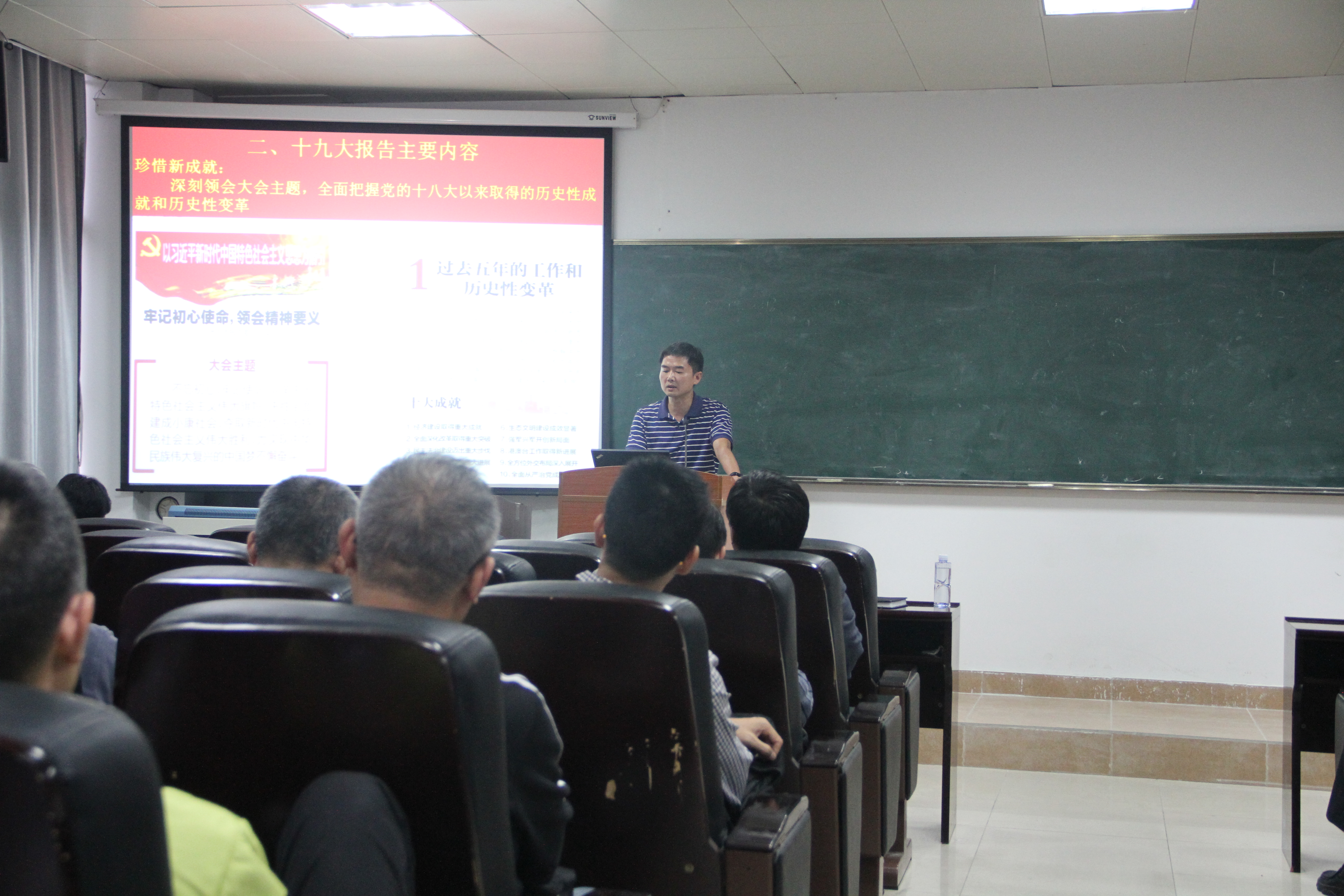 党委书记张明智传达了11月1日张彦书记在建南大会堂召开传达学习党的十九大精神大会内容和《中共中央关于认真学习宣传贯彻党的十九大精神的决定》,要求全院师生充分认识学习宣传贯彻党的十九大精神的重大意义,全面准确学习领会党的十九大精神。张明智作报告《以“新”的视角深刻领会十九大精神》,对十九大议程主题、十九大报告主要内容、报告核心亮点、深刻领会党章修正案重大意义进行解读。他强调,学习贯彻党的十九大精神是我们当前和今后一个时期首要政治任务,一定要在学懂弄通做实上下功夫,坚持不懈把落实十九大精神各项工作推向纵深。