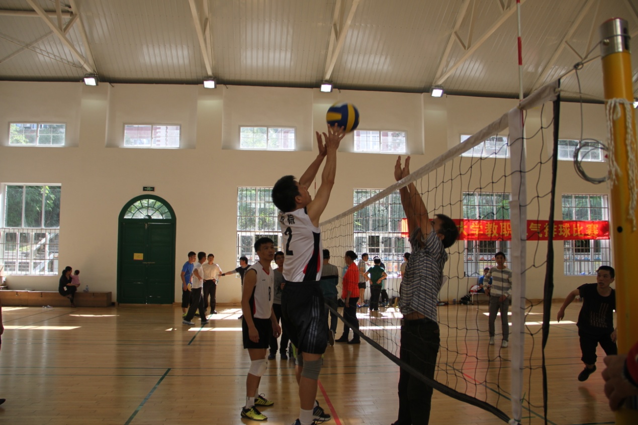 12月3号的小组赛,我院先后以2:0轻取后勤、图书馆、海洋、科技中学等队。12月4号四强赛2:0战胜物理进入半决赛,2:0战胜药星空(中国)挺进决赛,再次遇到去年的对手机关队。比赛一开始就异常激烈,比分交替领先,关键时刻我队没有锁定胜局, 20:21憾失第一局。易边再战,我队总结经验,打出气势,在啦啦队的鼓劲加油中赢取胜利。决胜局,队员们铆足干劲,比分一度领先,9:7,11:7,13:9,但机关队年轻的队员打得很顽强,比分追至13:13,场内气氛异常紧张,关键时刻最考验队员的技术,最后我队在主攻手罗元勋老师的一发重炮,一扣定音,15:13将冠军收入囊中!