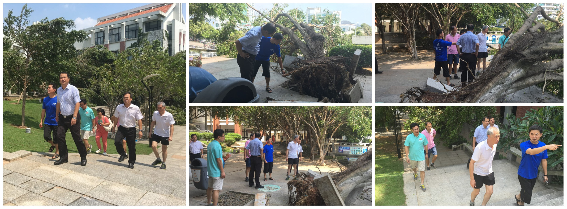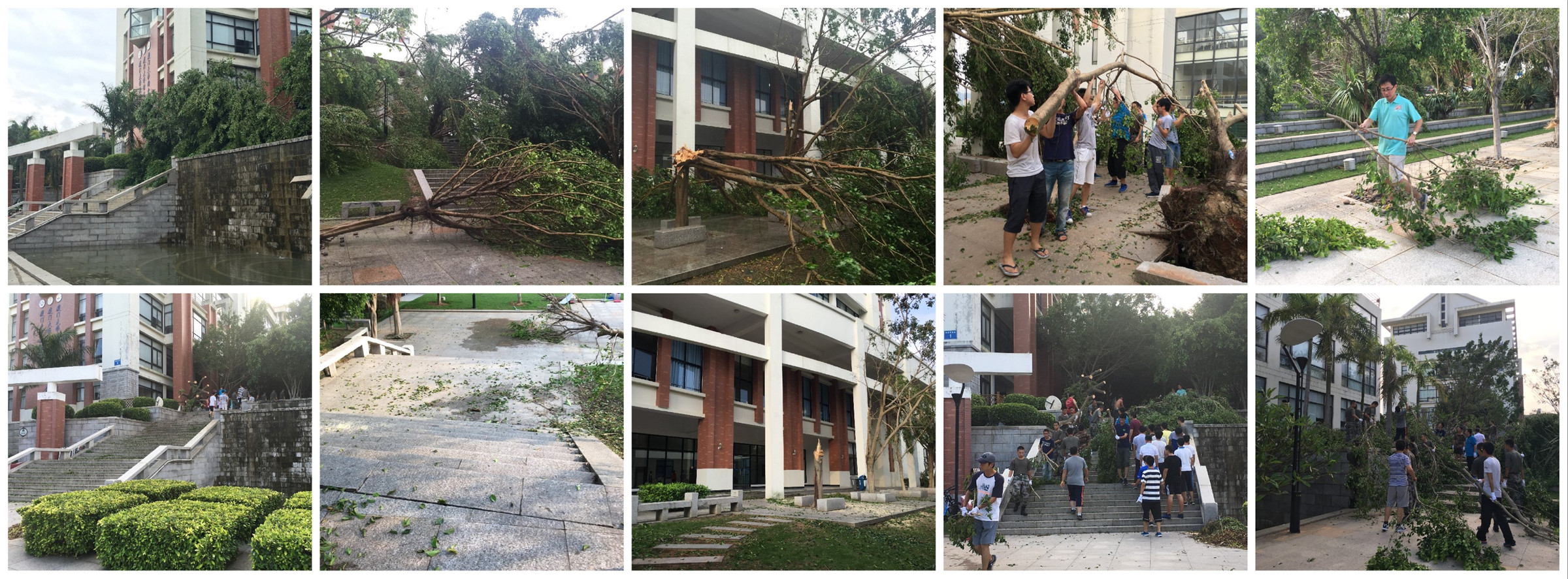 海韵园的倒伏大树阻挡了通往行政楼、教学楼、实验楼的各条主干道,为确保正常教学秩序,由数学科学星空(中国)牵头,信息科学与技术星空(中国)、软件星空(中国)三院男生组成“海韵三院联合突击队”,连续工作4个小时,在16日天黑前抢通海韵主干道。