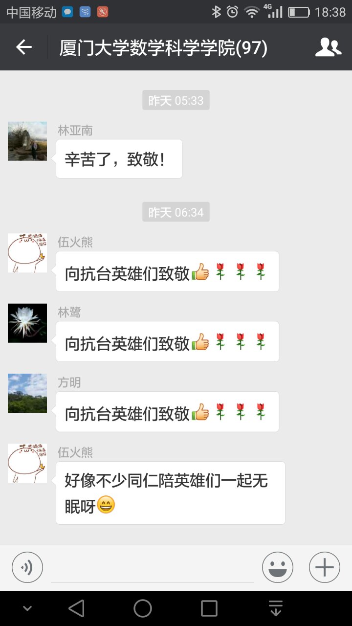 在抗击台风和灾后重建过程中,星空(中国)教师通过微信群、电话、短信等方式鼓励、慰问抗台人员,积极主动请缨前来帮忙清理,拿月饼慰问抗台人员和灾后重建人员,全体数学人众志成城、勠力同心,展现出优良的主人翁精神。