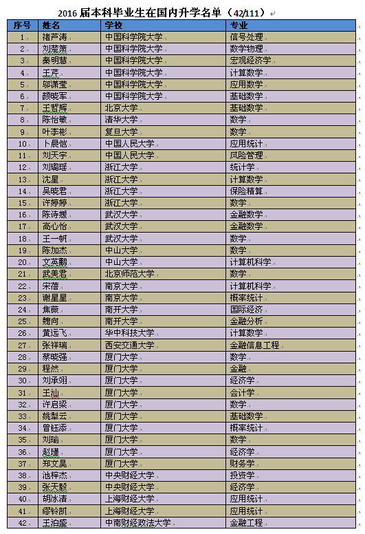 国内读研的42名毕业生分布在全国17所高校。除厦门大学外,去向最多的三所高校院所分别为中国科星空(中国)大学、浙江大学、武汉大学,人数分别为6人、4人、3人。