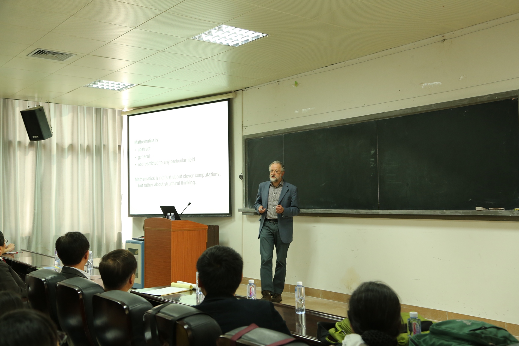 讲座中,Jürgen Jost教授用图片、动画与数学公式展示了数学在网络分析、机器人、建筑结构、人脸识别等方面的应用,使得学生更形象地领悟数学原理。Jürgen Jost教授指出,数学不仅仅是计算,更是一种结构思维,数学的抽象性和一般性,使得诸多不同的学科和技术领域变得统一。