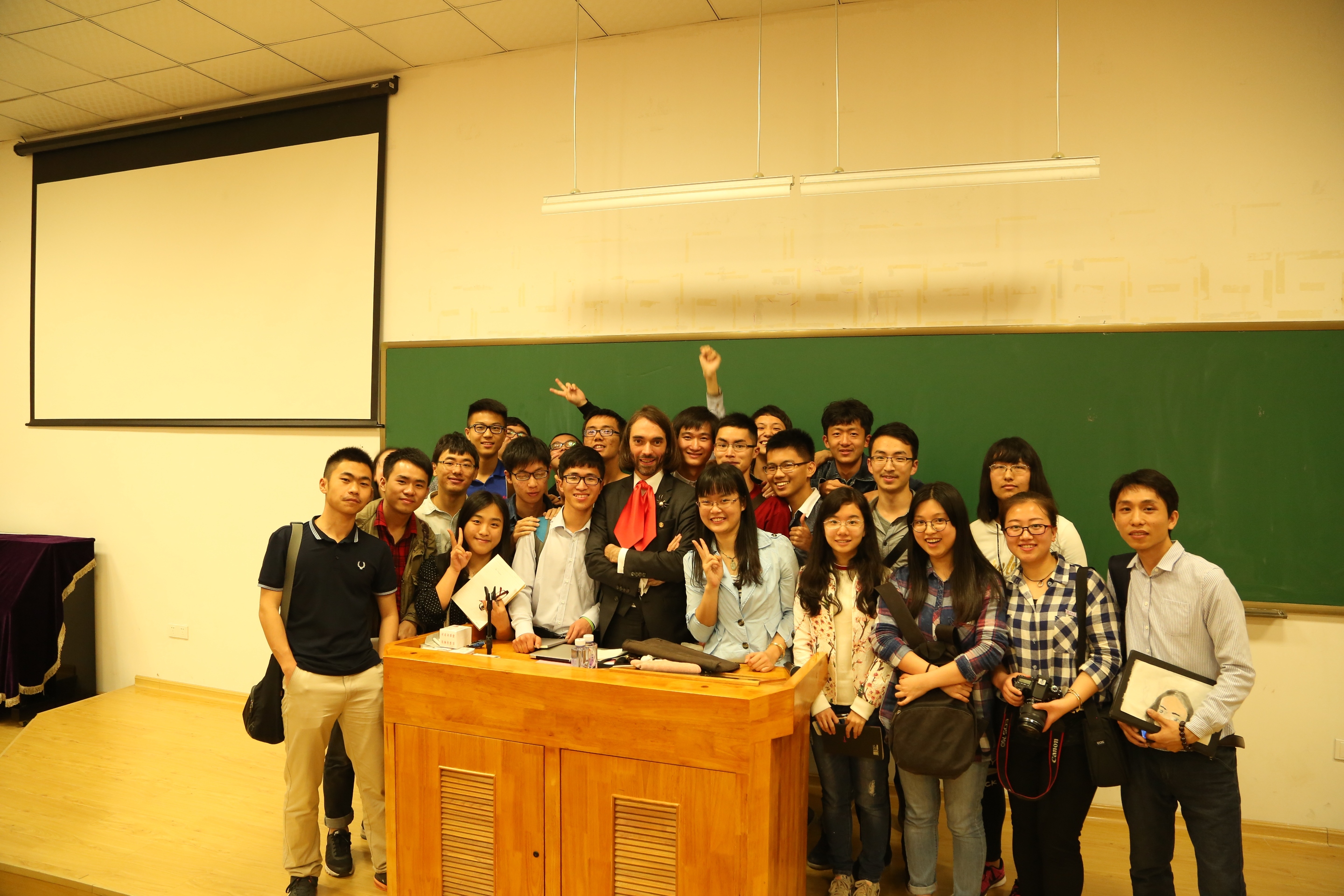 Cédric Villani教授是继丘成桐教授、Efim I Zelmanov教授后第三位到我校讲学的菲尔兹奖获得者。这位披着长发、带着领花、别着蜘蛛胸针,并被称为“数学界的摇滚明星”的年轻数学家,不仅打破数学人孤独、古怪的刻板印象,更是努力尝试打破数学与世人的隔阂,展现数学之美。他的讲座信息一经公布,即在全校师生中刮起了一阵“追星”旋风,部分师生专门购买Cédric Villani教授撰写的《一个定理的诞生——我与菲尔兹奖的一千个日夜》英文版和中译本排着长队请他签名。举办Cédric Villani教授学术报告会,为师生与菲尔兹奖获得者近距离交流、开展国际学术科研合作搭建了平台,同时也提升了学生学习数学的兴趣,扩展了师生的学术视野。