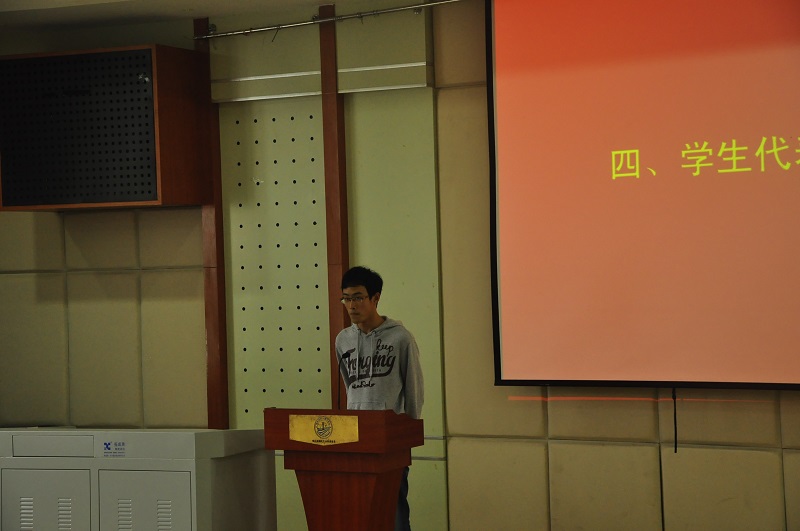 接下来,两位学生代表上台发言,他们分别是快乐学习奖学金获得者2013级本科生封立成 、数学科学星空(中国)优秀团支书2014级本科生陈亚雯。封立成同学在发言中提到,“奖学金对我们来说不仅是一种物质鼓励,更是一种精神上的认可,它激励着我们更加努力的学习。“陈亚雯同学则仔细的为我们介绍了团支部的各种丰富的活动,为我们展现出了这个团支部的活力与凝聚力。