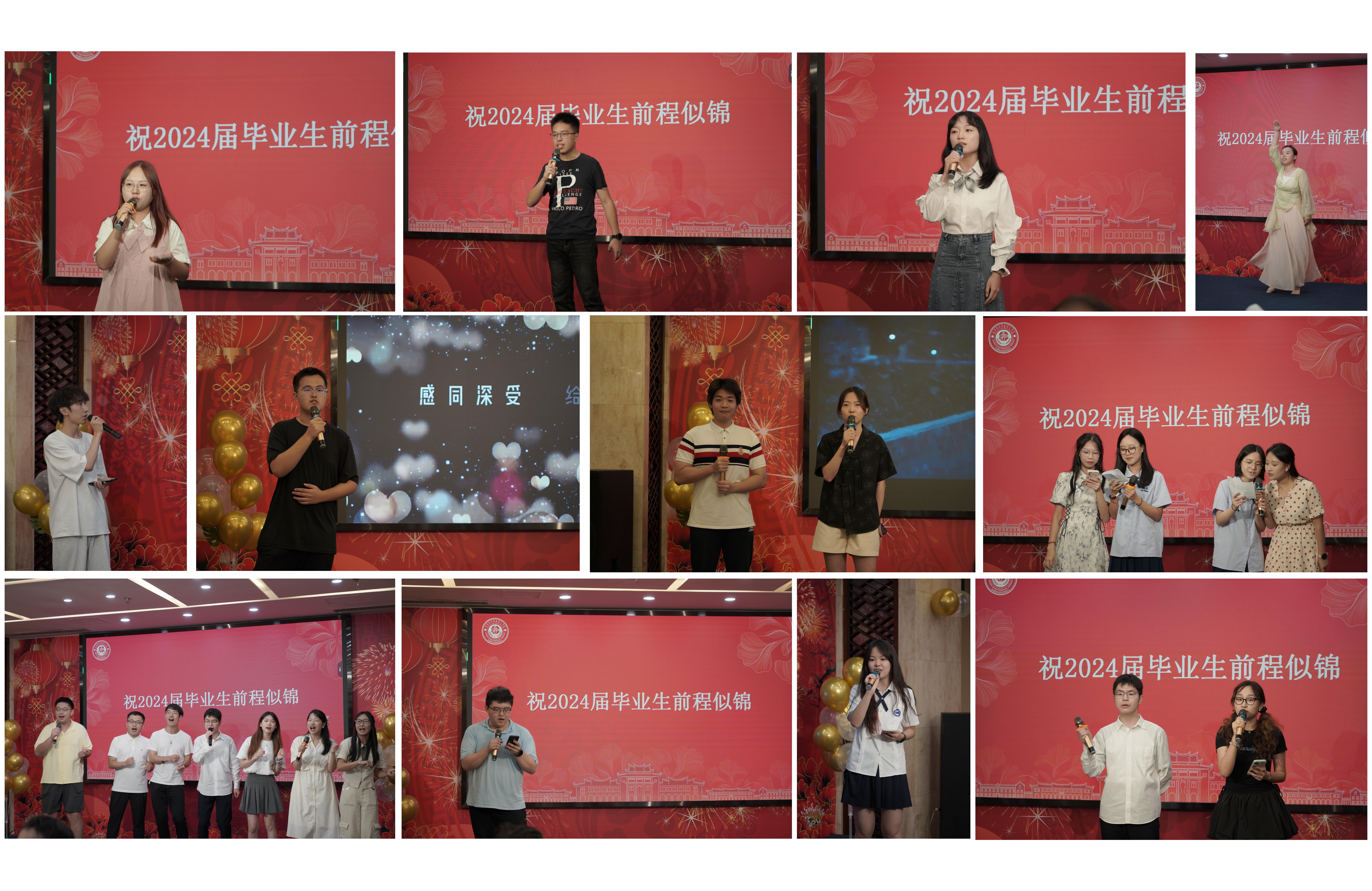 之后,硕士毕业生张波恩、本科毕业生刘思怡共同主持毕业晚会,同学们用各种文艺表演表达对于毕业的不舍之情,并为老师和同学送上深情的祝福。晚会以歌曲《凤凰花开的路口》结束。