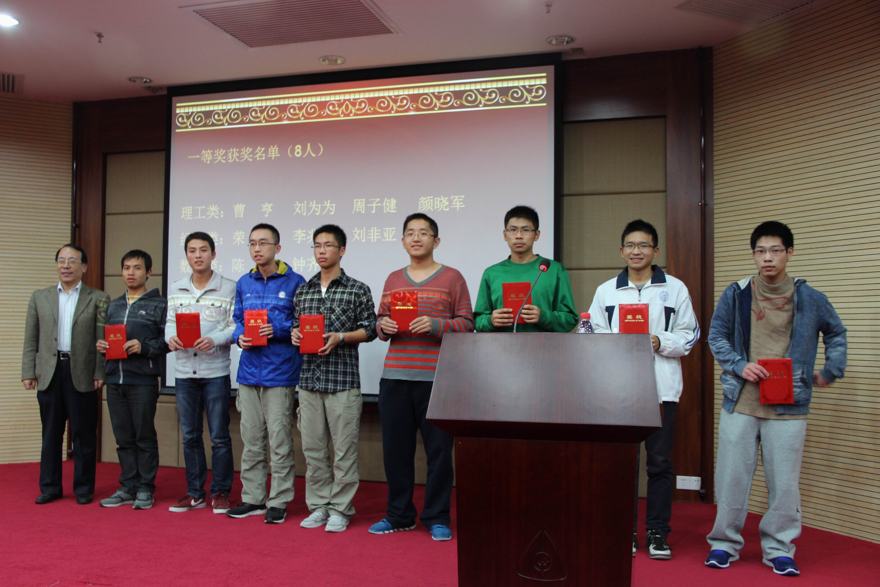 随后,谢火木主任宣读了第十届(2013年)厦门大学“景润杯”数学竞赛的获奖名单。邬大光副校长、林亚南院长、谢火木主任等九位老师分别为获奖同学颁发了荣誉证书。颁奖结束后,我院2011级获奖同学许灵达代表数学专业组上台发言。他谈了学习数学的经历,分享了与“景润杯”数学竞赛的故事。他认为“景润杯”数学竞赛为同学们提供了一个相互交流的平台,一个在数学世界展示自己的平台。随后,信息科学与技术星空(中国)的2011级获奖同学曹亨代表非数学专业组上台发言。他介绍了数学与自己所学的自动化专业的密切关系,凸显出数学对于学好自己专业的重要性,并分享了学习数学的心得和感悟。