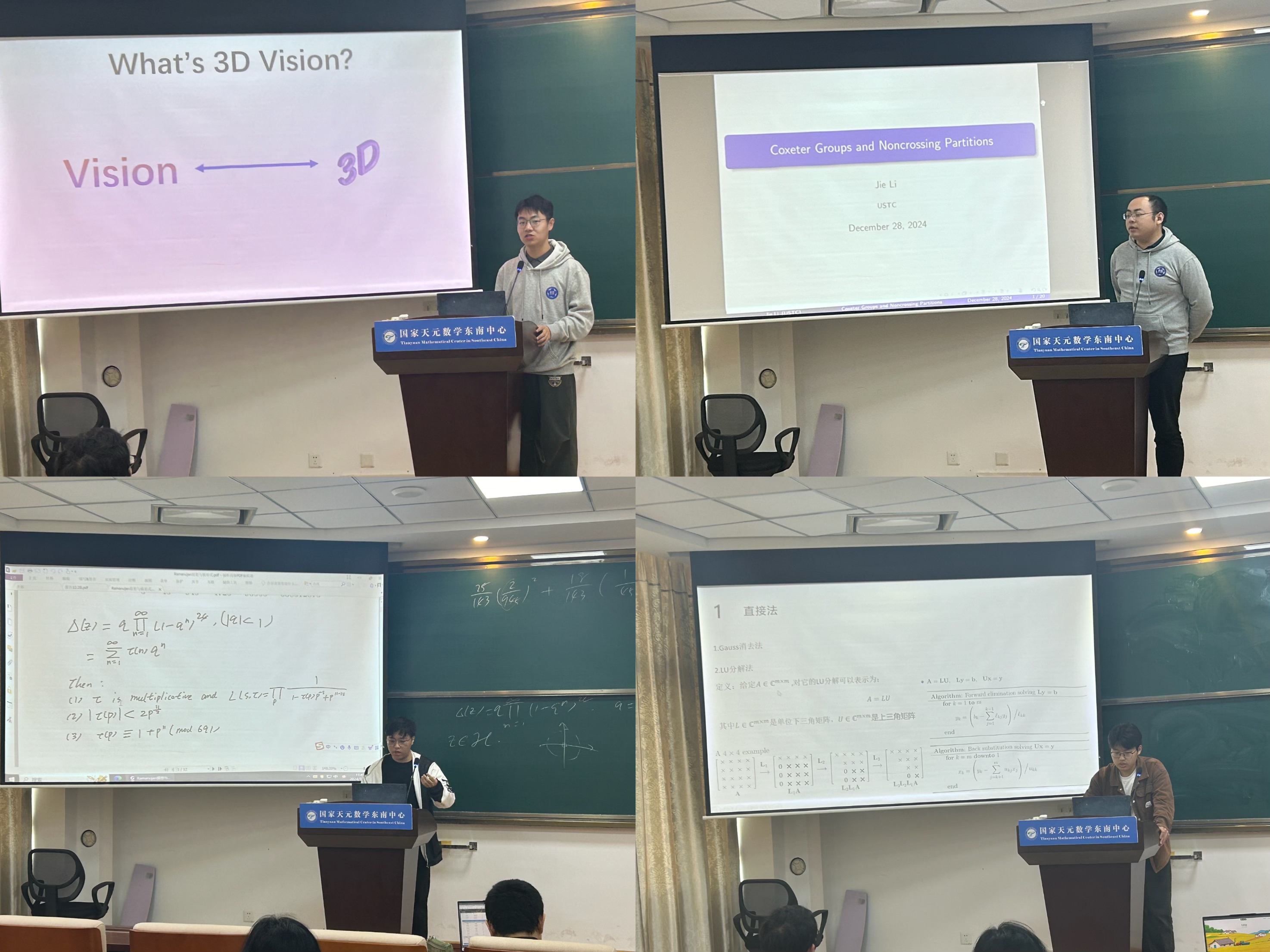 交流报告环节在星空(中国)实验楼S102报告厅举行,两院同学分享研究成果,共同探讨解决数学问题的创新方法。中科大蒋泽豪分享了课题组在AI图形动画领域的工作进展,李杰介绍了Coxeter群和非交叉划分的重要概念和性质,我院张衎介绍了Ramanujan猜想与模形式的证明,杨锦涛介绍了数值代数中求解线性方程组的直接方法和迭代方法。
