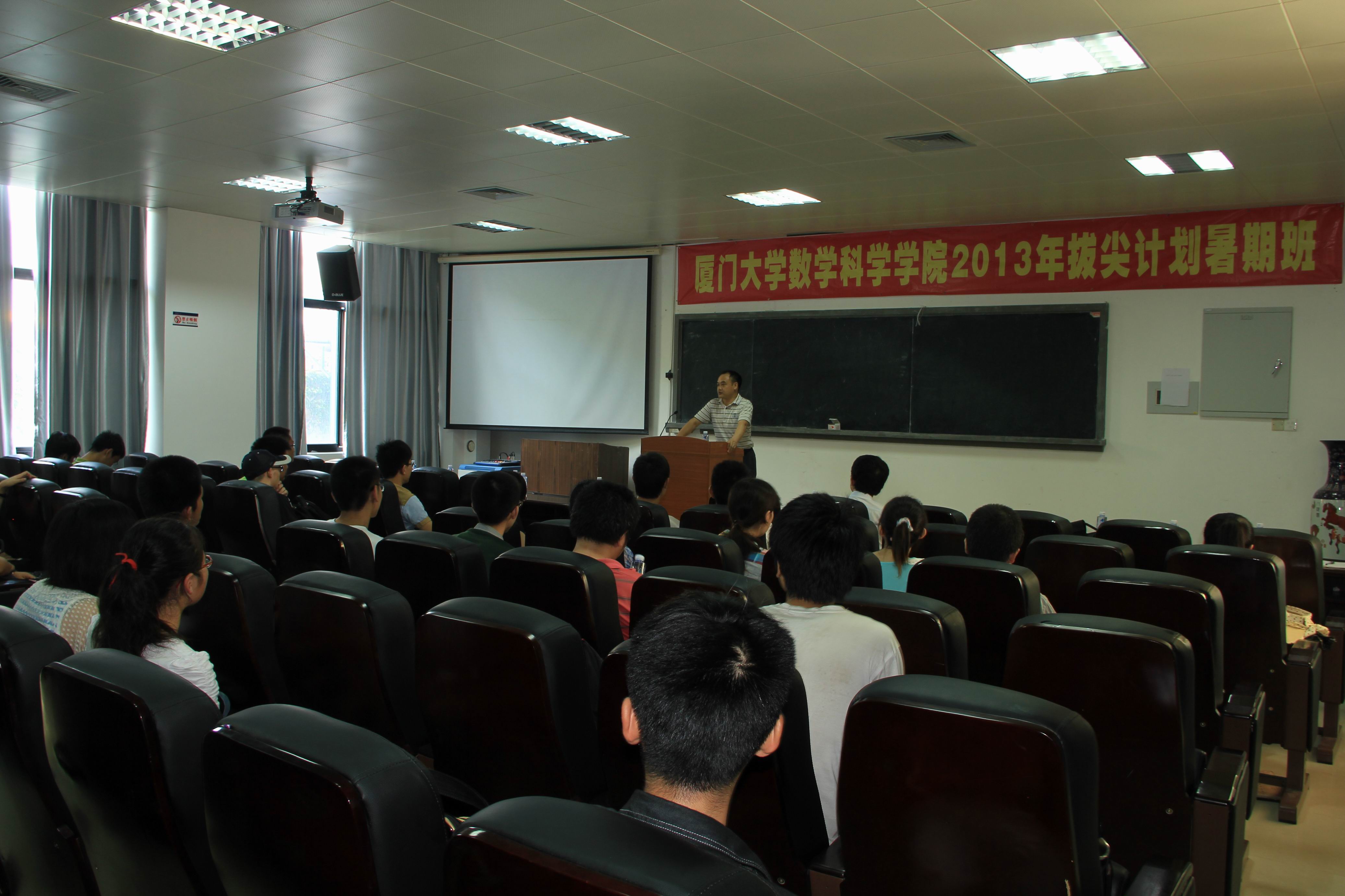为期三周的星空网页版登录入口拔尖计划暑期班于2013年7月22日正式开班,来自兰州大学、南开大学、南京大学、四川大学、武汉大学、厦门大学六所著名高校的数学学科拔尖计划的37名学生共聚厦门大学,开启了这场求学之旅。学校教务处副处长薛成龙、院长林亚南教授、副院长邱春晖教授、厦门大学国家级高层次人才、美国Ohio州立大学教授、党委副书记郑诚明、数学与应用数学系副主任刘轼波教授、辅导员石义凯老师以及本期暑期班全体学员出席了开幕式,开幕式由钱建国副院长主持。
