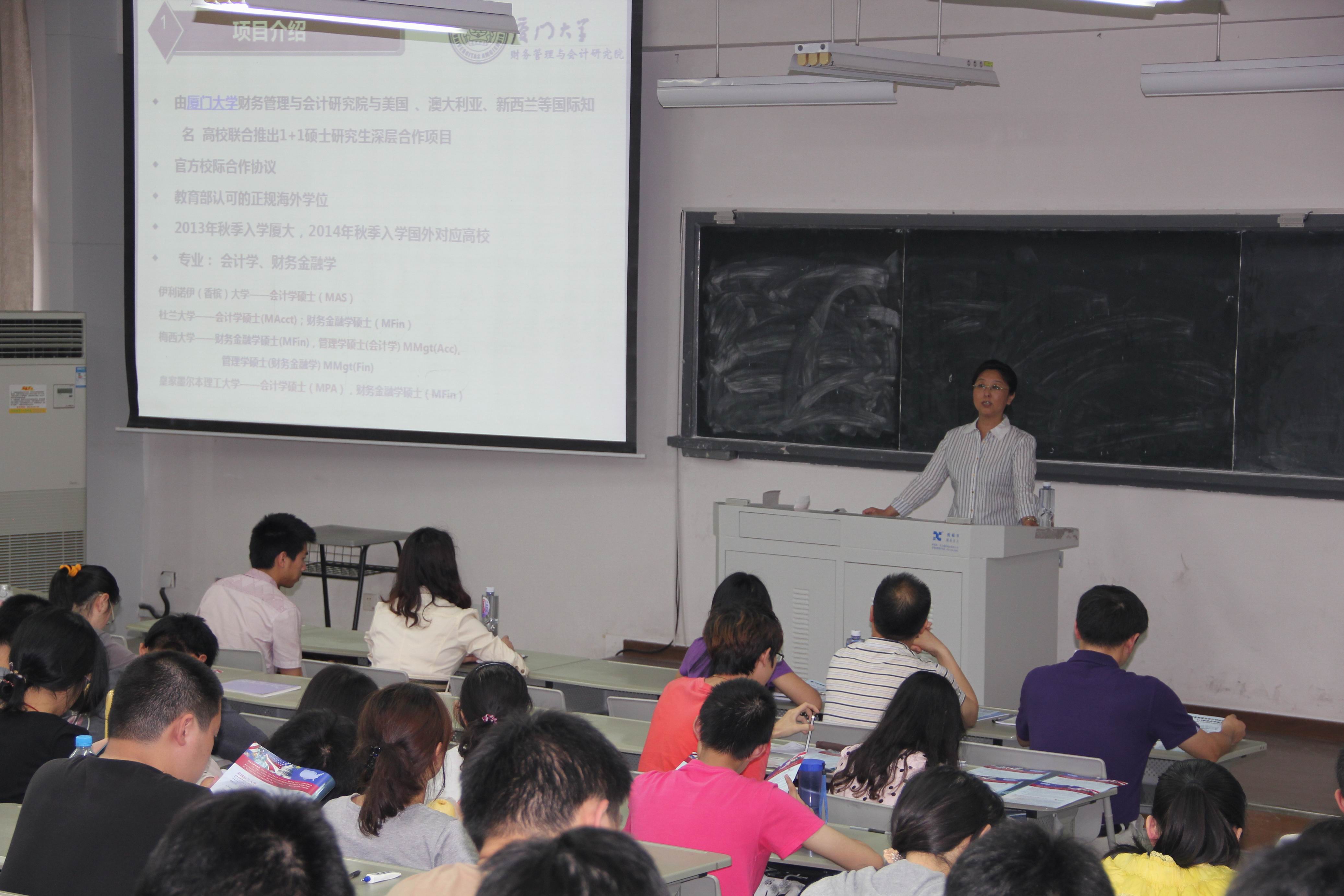 介绍会上,张国华教授主要就我校财务管理与会计研究院的综合实力、1+1联合办学项目的独特优势、与之联合办学的美国伊利诺伊(香槟)大学、美国杜兰大学、新西兰梅西大学、澳大利亚皇家墨尔本理工大学做了详细介绍。厦门大学财务管理与会计研究院的学术带头人和教学科研骨干长期活跃于国内外学术舞台,具有丰富的教学、科研和咨询培训经验,并且与政府机关和实务部门保持广泛的联系。通过该项目,学员可以同时享有厦门大学财务管理星空(中国)与国外大学优质的教育资源,而教育部认证的国外学位证书和厦门大学及IFAS卓越的学术声誉,将为学生提供更为广阔的就业前景。