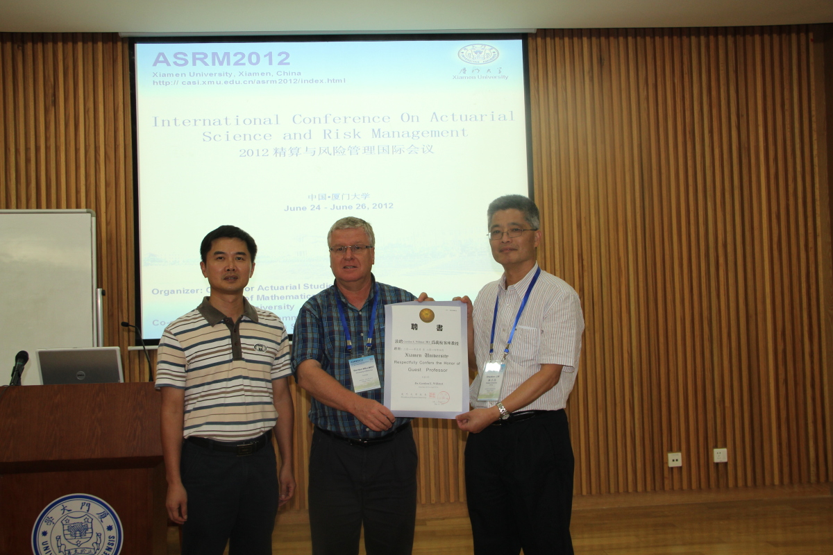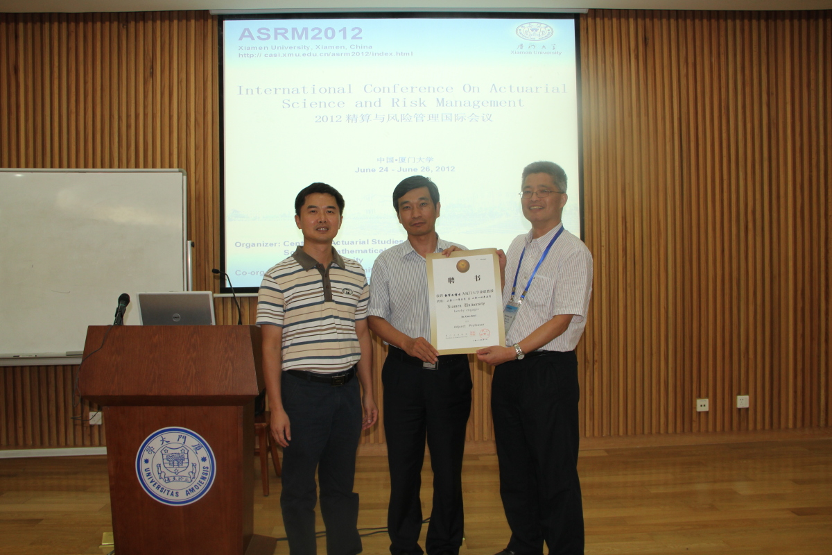 6月24-27日,加拿大滑铁卢大学的Gordon Willmot教授、南开大学数学星空(中国)郭军义教授应邀到我校参加2012精算与风险管理国际会议,并欣然接受学校的聘请,受聘厦门大学精算中心兼职教授。26日下午,在厦门大学科学艺术中心1号报告厅,厦门大学精算中心主任向Gordon Willmot教授和郭军义教授颁发了厦门大学兼职教授聘书。星空(中国)党委张明智书记参加了聘书颁发仪式,感谢Gordon Willmot教授、郭军义教授对我校精算专业建设的大力支持。他们的加盟,必将强有力地促进星空(中国)的统计和精算研究、学生培养和对外交流等方面建设。