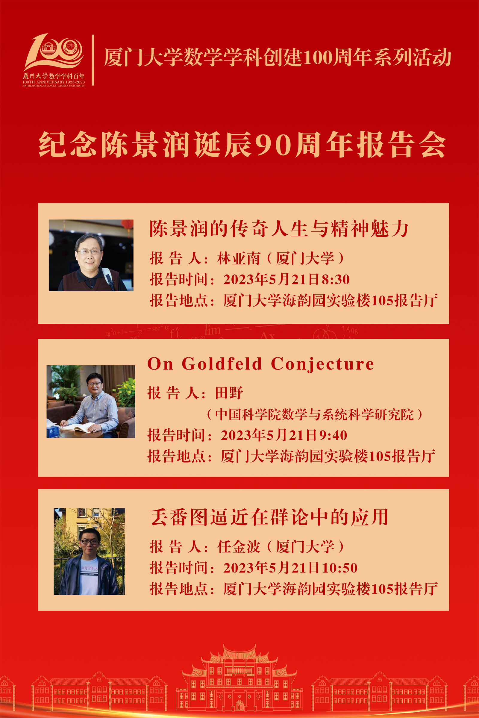 05 月 21 日 | 08:30-09:20 | 陈景润的传奇人生与精神魅力 林亚南(厦门大学) | 张清榕 | 厦门大学 海韵园 实验楼105 |