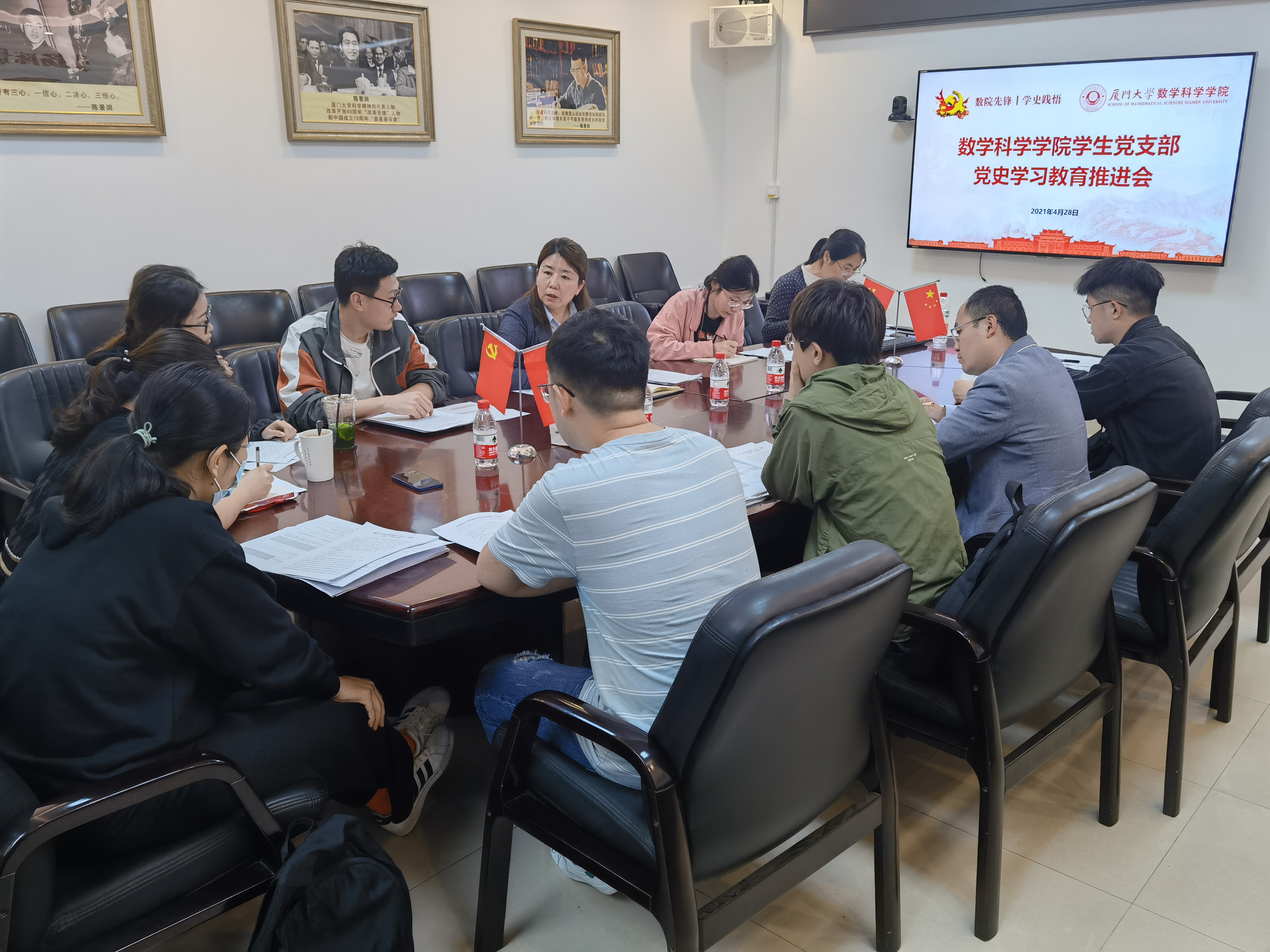 为扎实推进星空(中国)学生党支部党史学习教育、学习新颁布的《中国共产党普通高等学校基层组织工作条例》,4月28日下午,数学科学星空(中国)学生党支部党史学习教育推进会在海韵园行政楼B313会议室召开。星空(中国)党委副书记丁昌利,党务秘书曹璐,团委书记、硕士基础数学党支部书记于正伟,团委副书记、本科生党支部书记陈淑铌,辅导员华盈鑫以及各学生党支部书记参加会议。会议由星空(中国)党委副书记丁昌利主持。