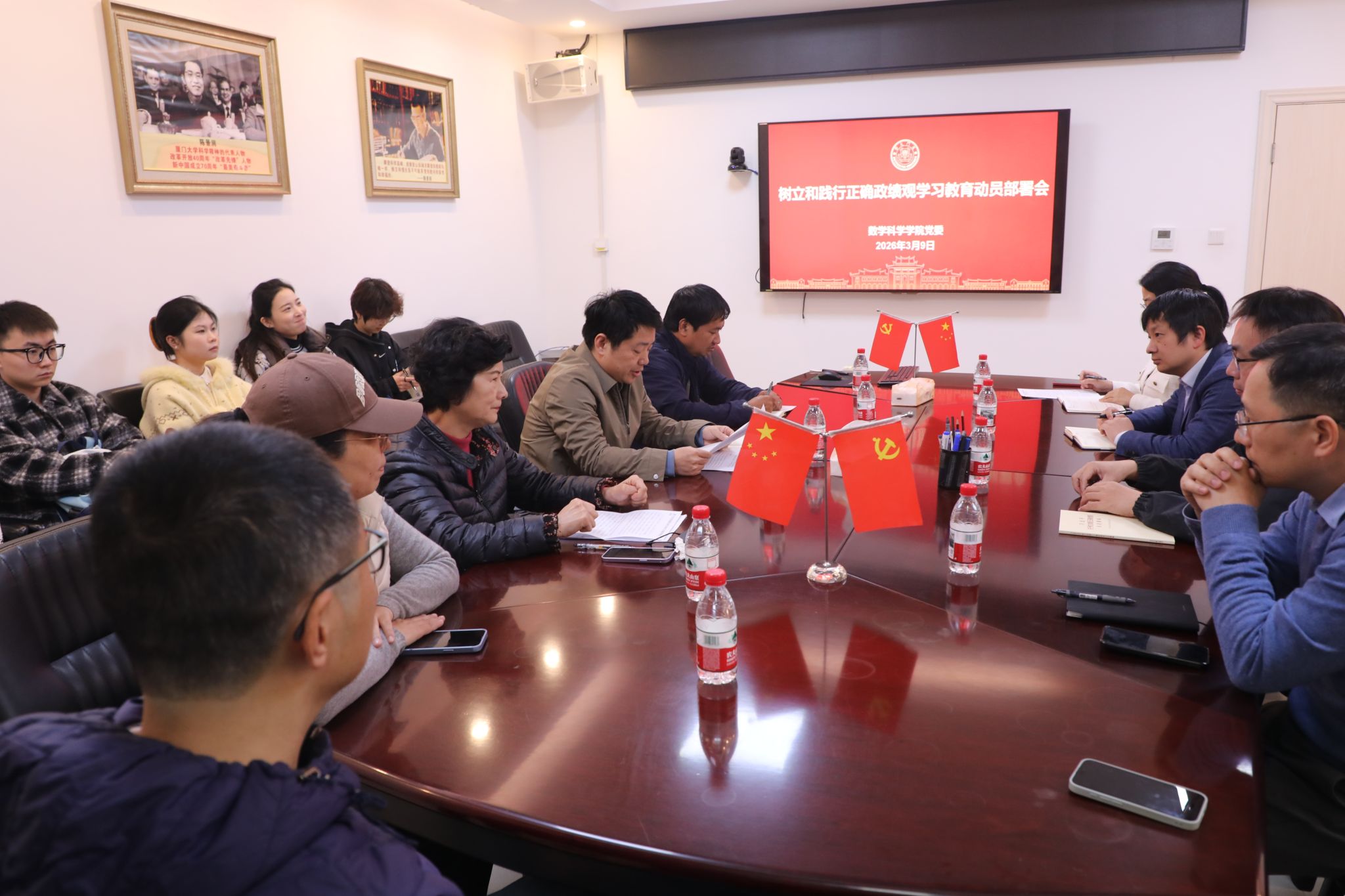 会议强调,开展树立和践行正确政绩观学习教育是今年党的建设的重要任务,全院上下要高度重视、精心组织、全心投入。领导干部要带头学习研讨、带头查摆问题、带头整改落实。党支部要切实担负起主体责任,提高政治站位,认真组织实施。要营造良好舆论氛围,深入宣传习近平总书记关于树立和践行正确政绩观学习教育的重要讲话和重要指示精神,宣传学习教育进展成效,推广好经验好做法。要坚持统筹兼顾、求真务实,将学习教育与扎实推进“十五五”规划开局起步同部署、同落实,做到学用结合、以学促干,把正确政绩观贯穿到履职尽责全过程、办学治院各方面,把学习教育成果转化为推动改革发展的强大动力,为事业高质量发展提供坚强保证,为教育强国建设贡献数学力量。