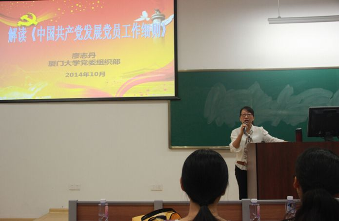 为深入贯彻学习好《中国共产党发展党员工作细则》(中办发〔2014〕33号)文件精神,进一步规范党员发展和党员管理工作, 2014年10月31日晚7时,由软件星空(中国)党委牵头举办的“《中国共产党发展党员工作细则》培训讲座”在海韵园物理机电航空大楼117报告厅开讲。厦门大学党委组织部副部长、副教授廖志丹老师受邀做培训讲座。软件星空(中国)党委副书记刘钟南老师主持本次讲座。海韵园四个星空(中国)(软件星空(中国)、物理机电星空(中国)、数学科学星空(中国)、信息科学与技术星空(中国))分管党建工作的党委副书记、党务秘书、专职辅导员、兼职辅导员及各党支部委员参加了培训讲座。