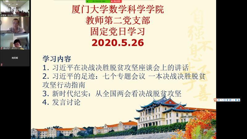 5月26日下午教师第二党支部在实验楼108教室进行了政治理论集中学习。每个月的第四周周二是教师第二党支部的固定党日。受疫情影响,三月份和四月份的固定党日活动都是在线上进行,随着复学复课有序进行,支部党员终于进行了开学以来第一次线下集中政治理论学习。大家佩戴党员徽章,戴好口罩,提前进入会场,正在国外研修的党员则通过视频连线参与集中学习,另外,入党积极分子熊涛教授也参加了此次支部集中学习。