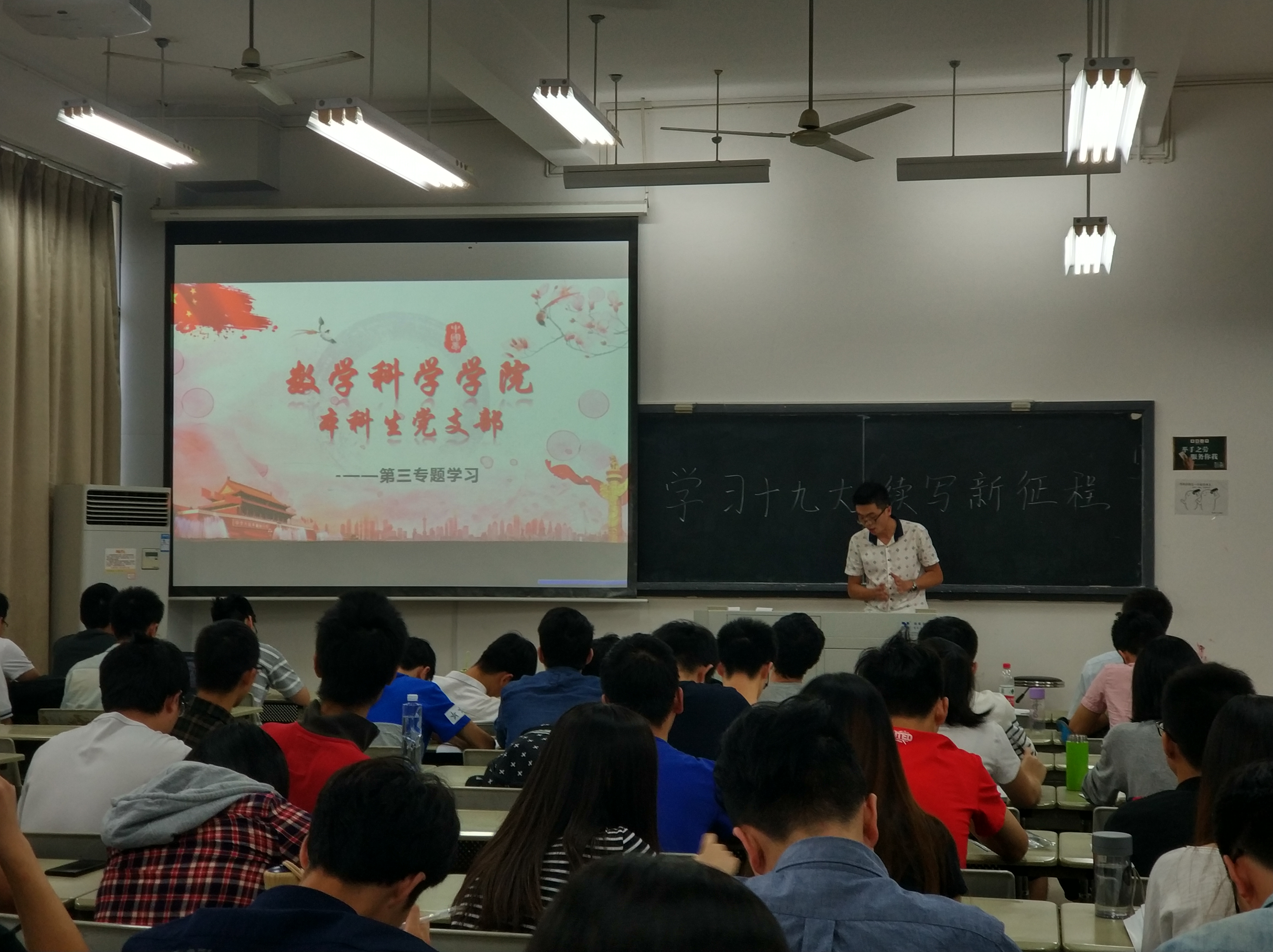 2017年10月24日下午,数学科学星空(中国)本科生党支部全体党员在海韵教学楼406教室开展“两学一做” 常态化制度化第三专题学习活动,本次会议的主题“不忘初心、牢记使命,学习贯彻党的十九大精神”,会议由支部书记廖康恩贝主持。