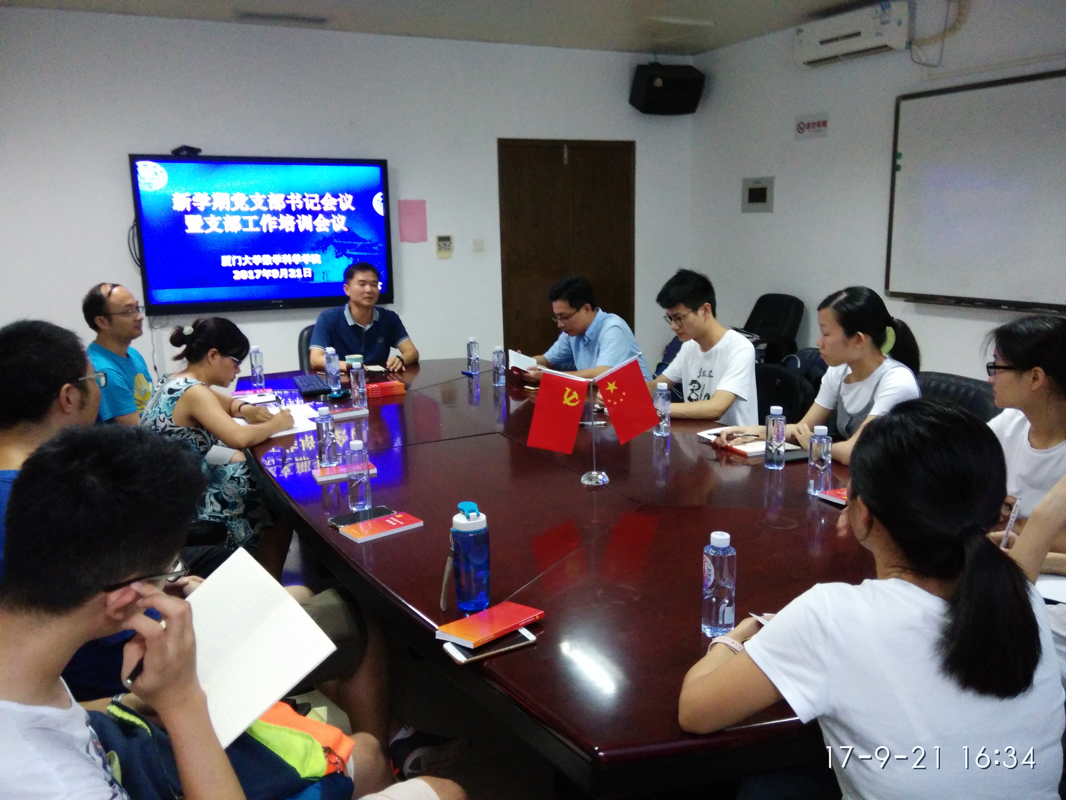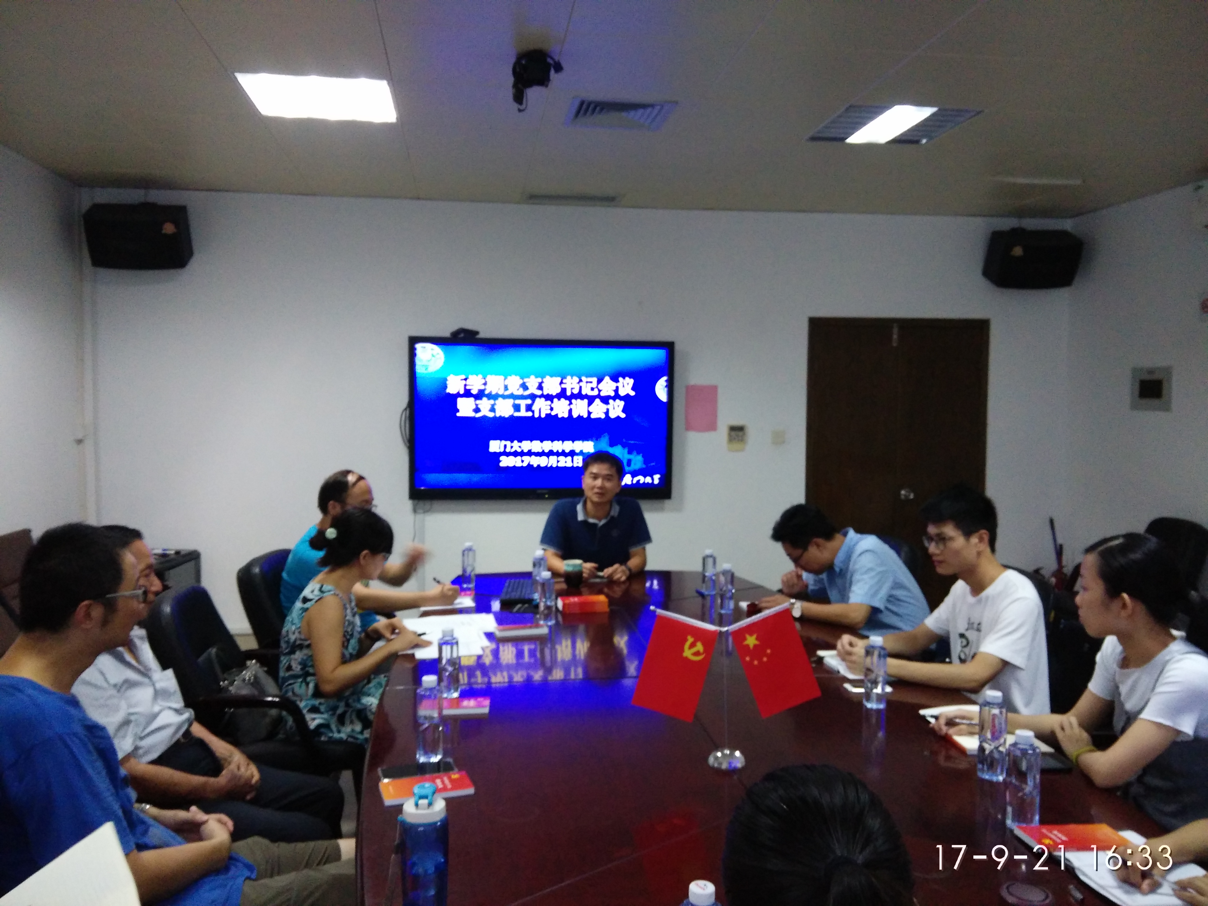 2017年9月21日下午,新学期党支部书记会议暨支部工作培训会在313会议室召开。党委书记张明智出席并讲话,党委副书记张剑文、全体党支部书记参加会议。