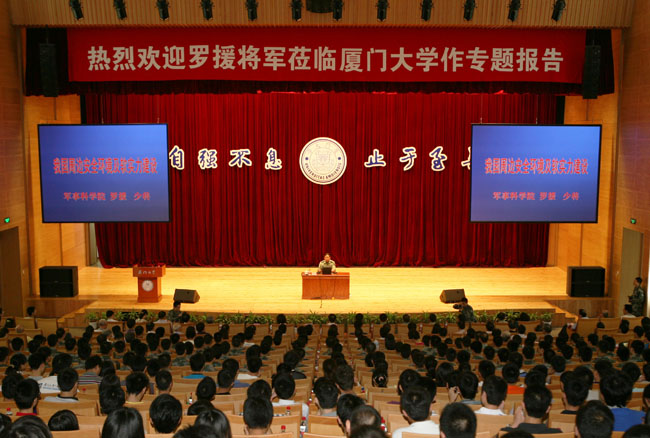 5月28日下午,军事科星空(中国)罗援少将作客我校党校名家讲坛,带来题为《我国周边安全环境及软实力建设》的精彩讲座。讲座开始之前,校党委书记杨振斌为罗援少将颁授厦门大学兼职教授证书。校党委副书记陈力文主持报告会。