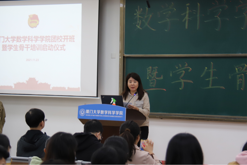 党委副书记丁昌利老师作培训动员讲话。她强调,通过本次团校暨学生骨干培训,希望同学们扎实学习贯彻习近平总书记致厦门大学建校100周年重要贺信精神、习近平总书记“七一”重要讲话精神和十九届六中全会精神,扎实推进“四史”学习教育特别是党史学习教育。希望学生骨干要做信念坚定、思想先进的引领者,笃信好学、日进有功的勤学者,不忘初心、矢志奋斗的实干者,围绕大局、服务师生的奉献者。肩负民族复兴之使命,紧跟时代步伐、紧扣时代脉络,为建设数学强国贡献力量。