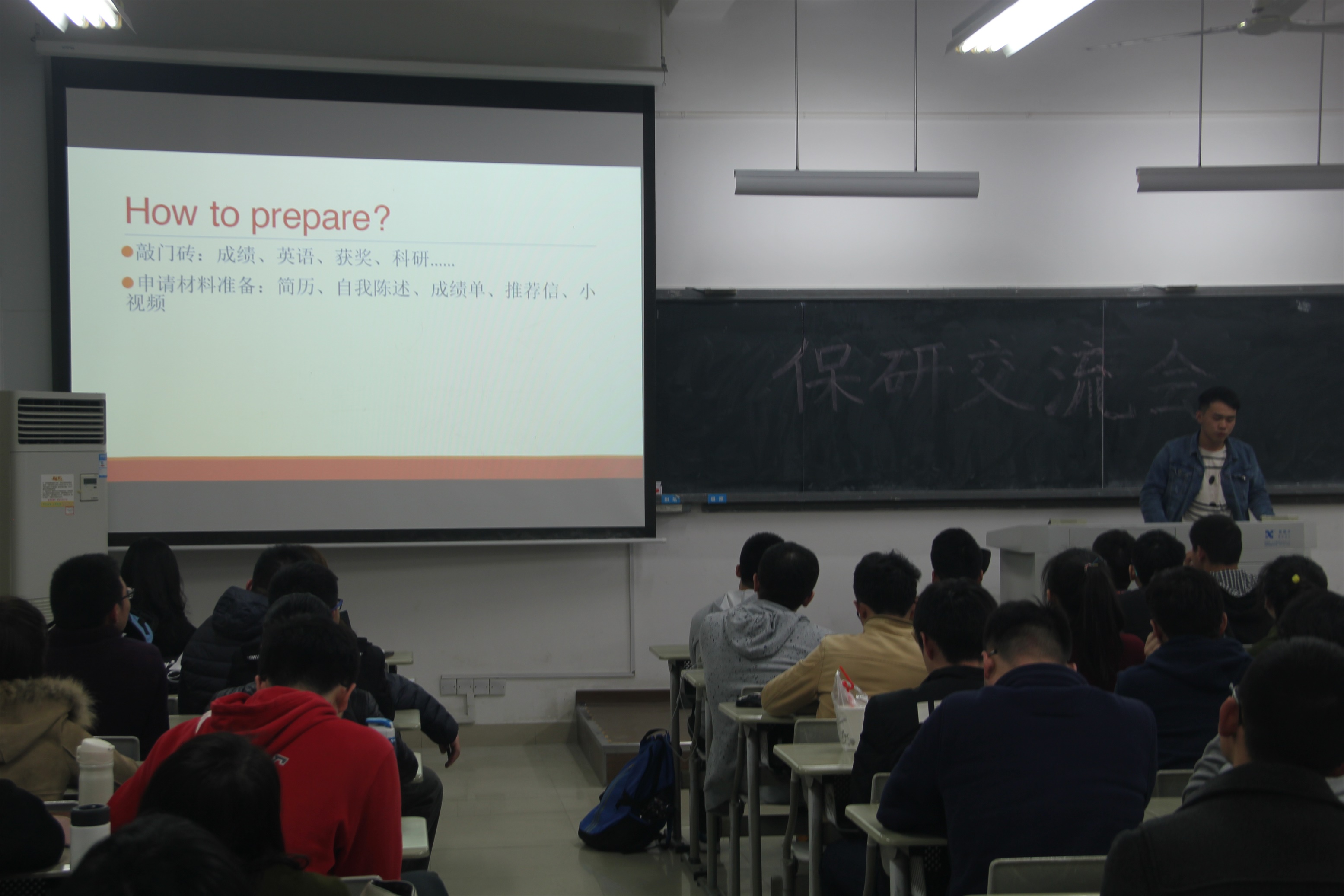 保研北京大学的陈开熠学长第一个为我们介绍他的经历,他提出要注重口语、实践经历和实习机会,以及面试的自我介绍和预先准备问答环节。
