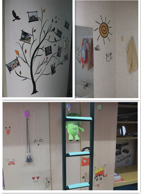 H5-207 ,这是一个叫“时代四撒姐妹花”的寝室,成员是王辰晔、郑家琳、翟紫雪、于凭跃。一打开门,就是粉与黑的照片墙——照片与值日表的结合。点缀着的手工、贴纸精致可爱,在装点小窝的同时,也传达出寝室的温馨可爱,她们的宣言是“为中华之崛起而美化宿舍!”。