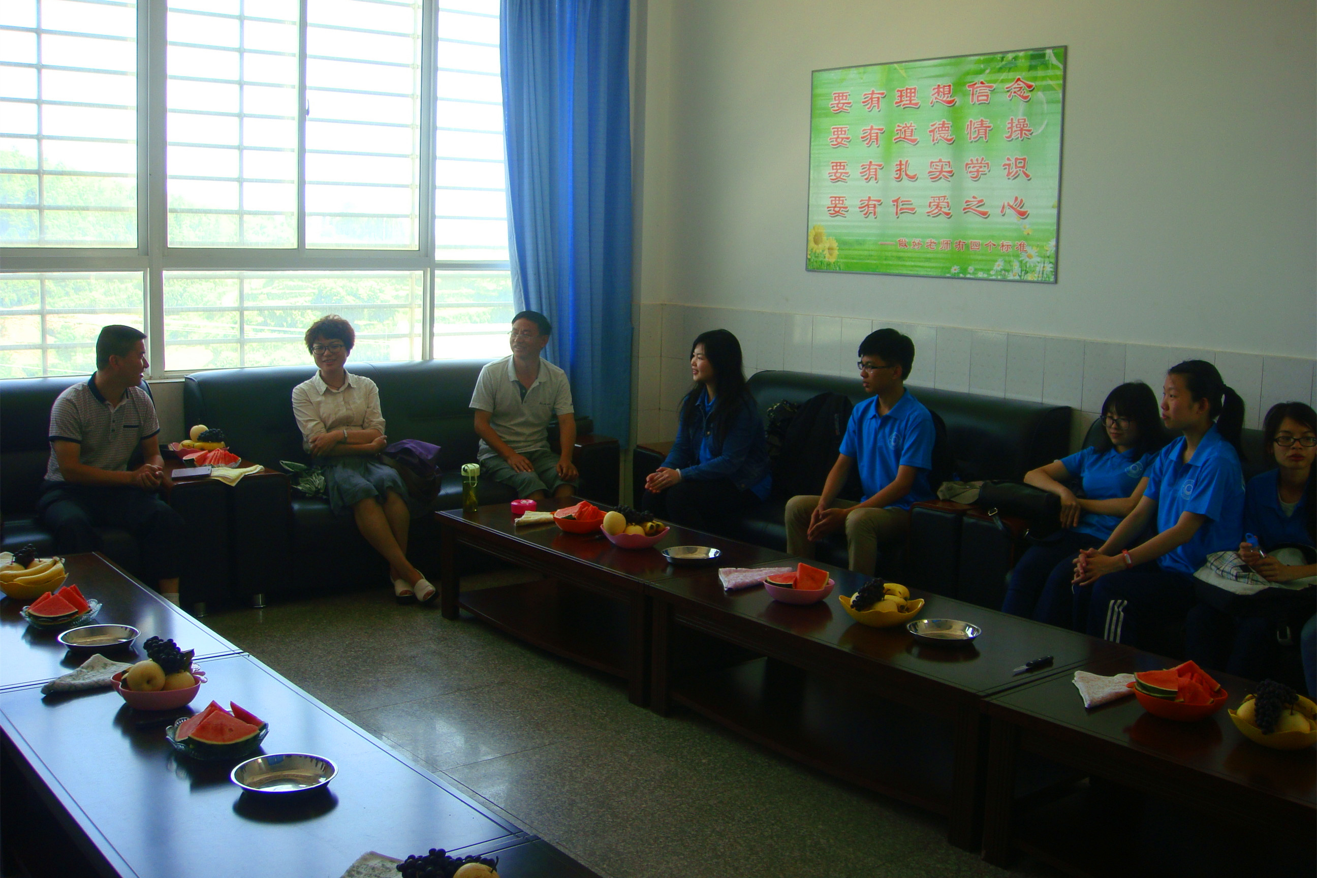 刘建云校长向我们一行人介绍了九乡民族中学情况。他告诉我们,九乡民族中学共有学生830多名,教职工54名;学生中彝族回族居多,约占全校总数的1/4;在条件落后的乡村,学校少年宫成功地创办了26个班级,这是他们的特色之一。之后双方校长就学生家庭情况、学校现状等方面进行了交流,实践队队长也向刘校长了解了学生毕业后流向问题。学生们初中毕业之后大多以务农或外出打工为主,只有一部分同学能够升上高中或职高。在九乡,家长们大多以种烤烟为生,近几年经济发展良好,但是对孩子的教育并不重视。这一点引起了双河民族中学张校长的共鸣,她表示这是云南乡村学校普遍存在的现象。