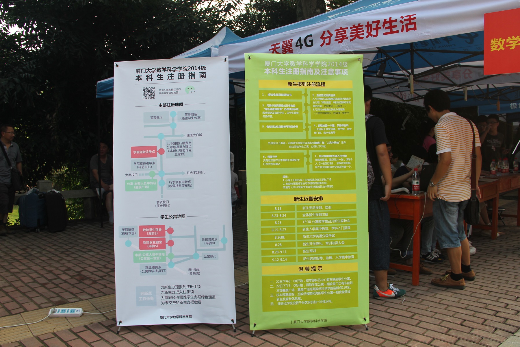 今年迎新我院有了很大的创新。首先,报到前一个月,微信迎新活动已经轰轰烈开启,《关于迎新期间交通管制的通知》、《学生工作到底是什么?》、《厦大攻略?》、《首先,你得有一个旅行包》等一系列新生攻略给还未到的14级新生一个对大学生活的初印象。其次,新生qq群的建立,让学弟学妹与学长学姐有一个提前交流的平台,满足自己对大学的好奇心。在迎新期间,我们还举行了为新生及其家长合影留念的活动,用相机为新生留下大学报到第一天这一值得纪念的一天。我院注册点的简易地图也是我院一大特色,并且地图附有二维码,新生和家长们只要“扫一扫”便可获得该地图的电子版,避免了自己“迷失”在厦大。