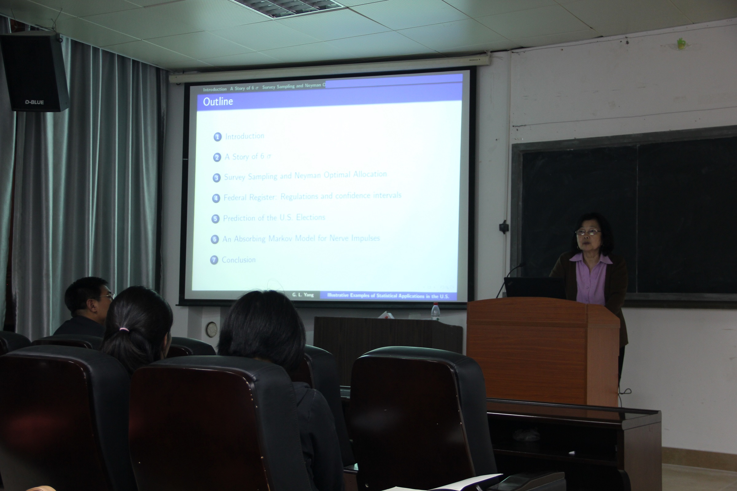 2014年4月3日晚7点,我院有幸邀请到了美国马里兰大学数学系教授、前美国国家科学基金会(US National Science Foundation)统计科主任(Statistics Program Director)——罗昭容教授,为我们带来题为Illustrative examples of statistical application in the US的学术讲座。讲座在实验楼504顺利召开,由金贤安教授主持。