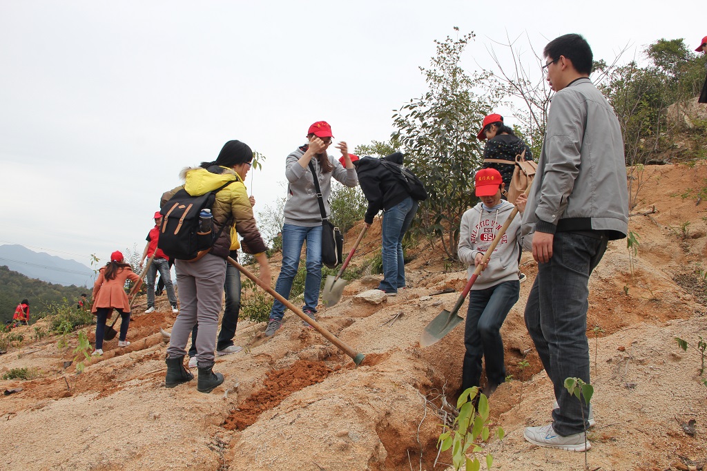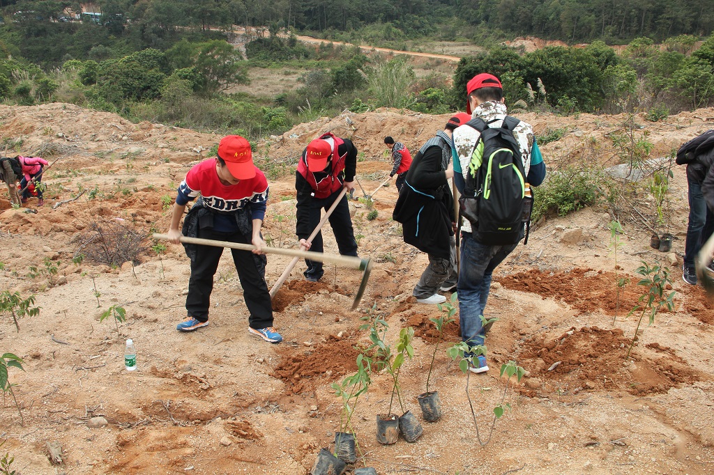经过一个多小时的车程以及十几分钟的徒步行走,数院植树小分队顺利到达植树地点——一个光秃秃的小山崖。荒凉的土地上摆满了待种植的小树苗以及各种工具,在志愿者宣读注意事项过后便是工作人员分发爱心早餐的时间。下坡的路很陡很难前行,吃过早餐的同学们鼓足干劲,在领取工具过后便三五成群地带着自己的小树苗开辟荒地。各组分工明确,挖坑、回填、栽植、覆土,相互帮助相互合作,每个人都在卖力地劳动着。很快,不到一个小时的时间里,原本荒凉的土地上缀满了绿色,大家看着自己种下的小树,忙碌后的喜悦溢于言表。
