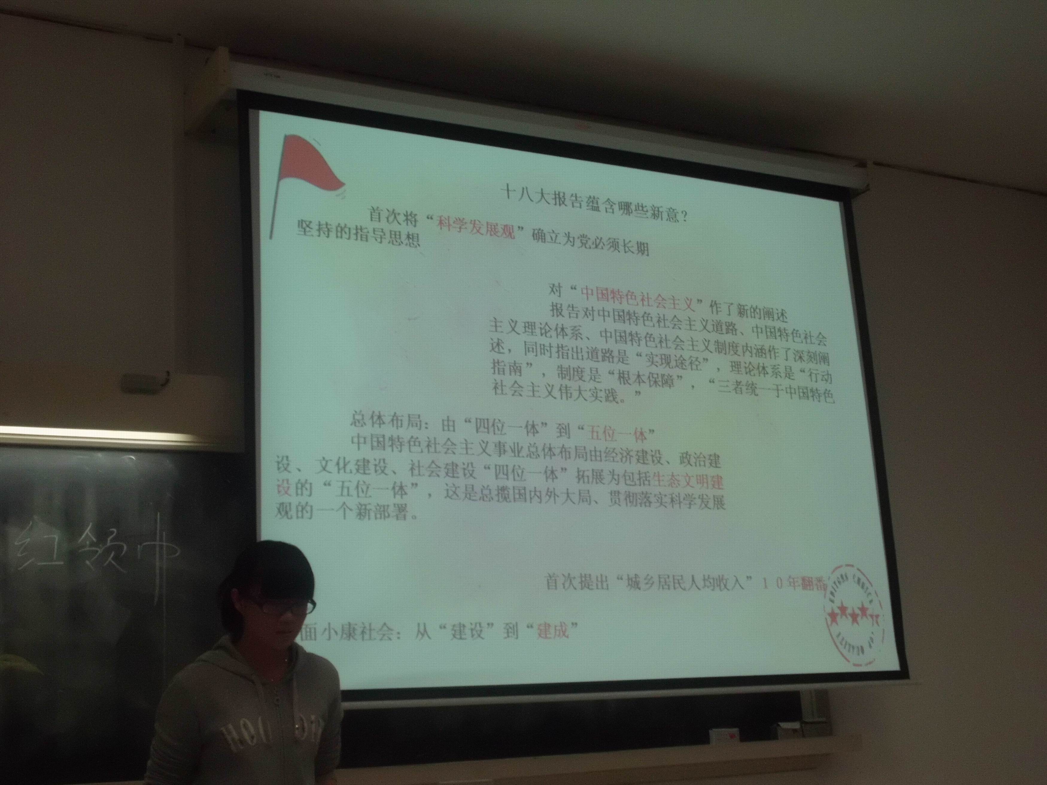 11月12日晚七时,为响应十八大号召,提升支部凝聚力,进一步增强大学生对党、对祖国的深厚感情,数学科学星空(中国)11级2班团课在海韵公寓教学楼204火热展开。