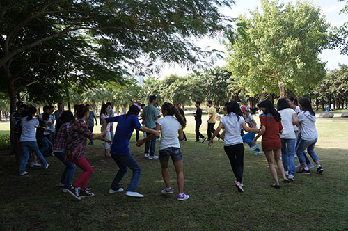 此次活动于早上9:00开始进行,在两位志愿者老师的带动下,研一新生共参与了五个活动项目。第一个游戏是“呼叫转移”,该游戏的目的是让大家记住各位同学名字,加深彼此的印象;然后是“五毛一块”、“解手链”团结合作的力量在这两个游戏中得到了充分的体现;接着是“开列车”,每个人的手搭在前面同学的肩上,将每一位研一新生的心串在了一起;最后一个游戏是“天龙八步”,通过八步的距离,来自五湖四海的新生团聚在了一个脚印里,聚在数院这个殿堂。活动于11:00在各位同学的欢笑声中结束。