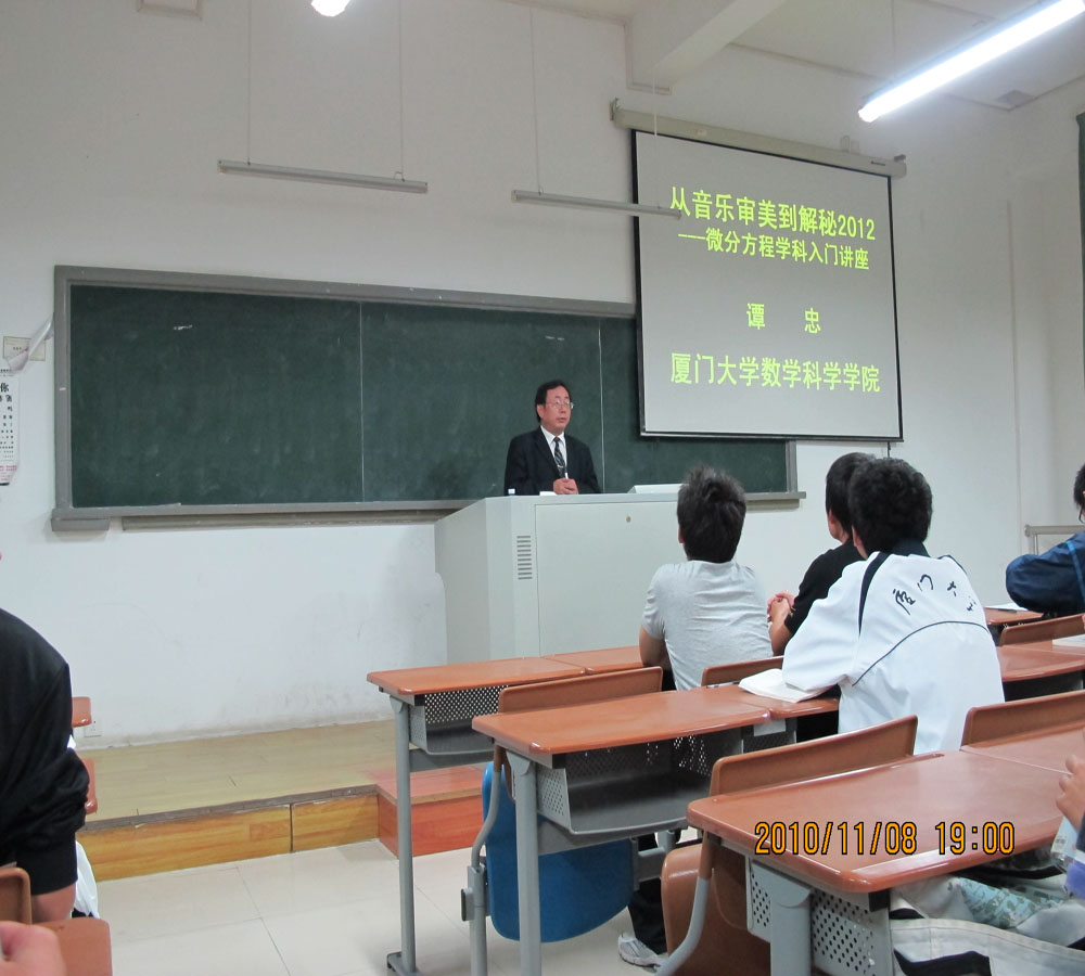 讲座过程中,谭忠教授从最受人们关注的“可怕的2012年预言”开始,通过向同学们介绍地震、海啸、龙卷风等自然灾害的形成,传播和预防,金融衍生品定价,军事战略安排,高新技术发展等知识,让大家感受到了生活中偏微分方程的重要意义。谭教授在讲座中旁征博引,深入浅出,用风趣的语言,将深奥的学术知识变成了简单易懂的道理呈献给了同学们,给听讲座的同学们留下了深刻的印象。