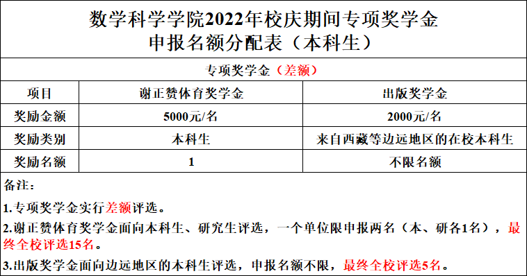 2022年校庆期间将评选颁发校级奖学金,提前发布专项奖学金(差额)评选,评奖工作有关事项通知如下: