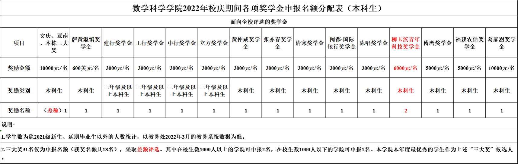 2022年校庆期间将评选颁发“文庆奖学金”、“本栋奖学金”、“亚南奖学金”等多项校级奖学金,现将各项奖学金评奖工作的有关事项通知如下: