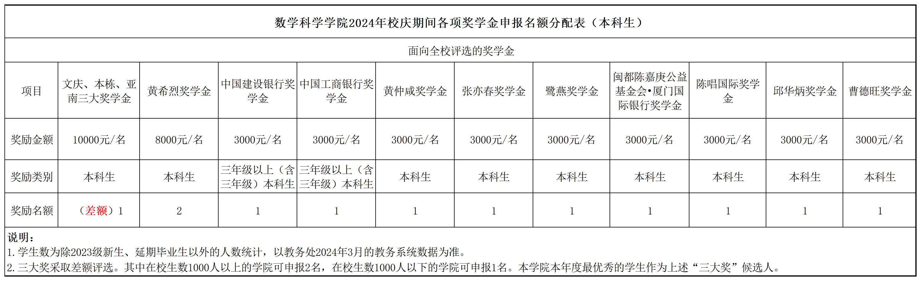 2024年校庆期间将评选颁发“文庆奖学金”“本栋奖学金”“亚南奖学金”等42项校级奖学金,现将各项奖学金评奖工作的有关事项通知如下: