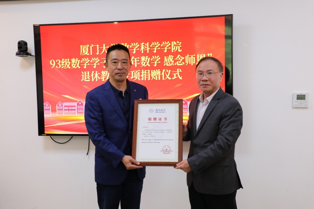 仪式上,谭绍滨对捐赠方鼎力相助母校建设与发展表示由衷感谢并向王华杰校友颁授捐赠证书。谭绍滨院长向校友介绍了目前数学学科的发展、学科百年庆的举办情况,他表示,数学系的校友们不仅关注厦大学子的成长,同时关爱退休教师老年生活,是厦大人传承嘉庚精神、弘扬嘉庚文化的生动实践。