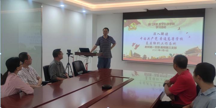6月8日,数学科学星空(中国)教师第一党支部和第三党支部在天元中心会议室联合开展“固定党日+”活动,集中学习《中国共产党普通高等学校基层组织工作条例》。